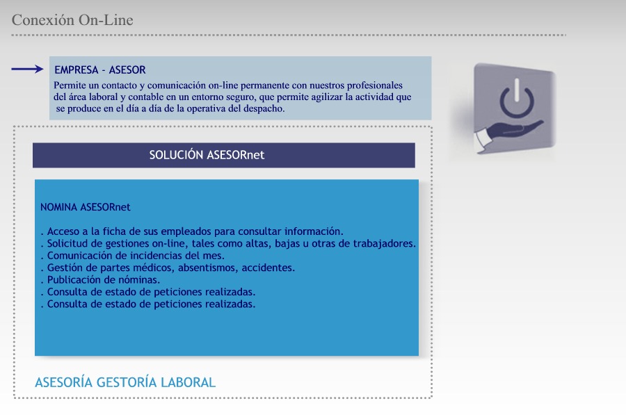 PORTAL DEL EMPLEADO: Damos un paso más en la prestación del servicio de nóminas dando acceso a sus empleados de a contenidos y servicios que su empresa ha definido. Le permite descentralizar las principales funciones de administración de personal, ej.: vacaciones y publicación de hoja de salario, tanto desde el punto de vista del empleado como de sus responsables. ESCALABILIDAD RRHH: El proceso de nómina está integrado en nuestra plataforma de Recursos Humanos, pudiendo gestionar los mismos según sus necesidades. Ampliamos el servicio a la gestión externalizada de Recursos Humanos, ej.: gestión de la formación, selección. ACCESO ONLINE: Nuestra plataforma permite consultar, acceder e interferir en tiempo real al proceso de Nóminas o recursos humanos que tengan externalizado con nosotros. EQUIPO: Todos nuestros profesionales son titulados universitarios, diplomados en Relaciones Laborales y/o abogados altamente cualificados. Su interlocutor entenderá su negocio facilitándole un nivel de servicio de asesoría y de gestión de la nómina incomparable con otros modelos de externalización.